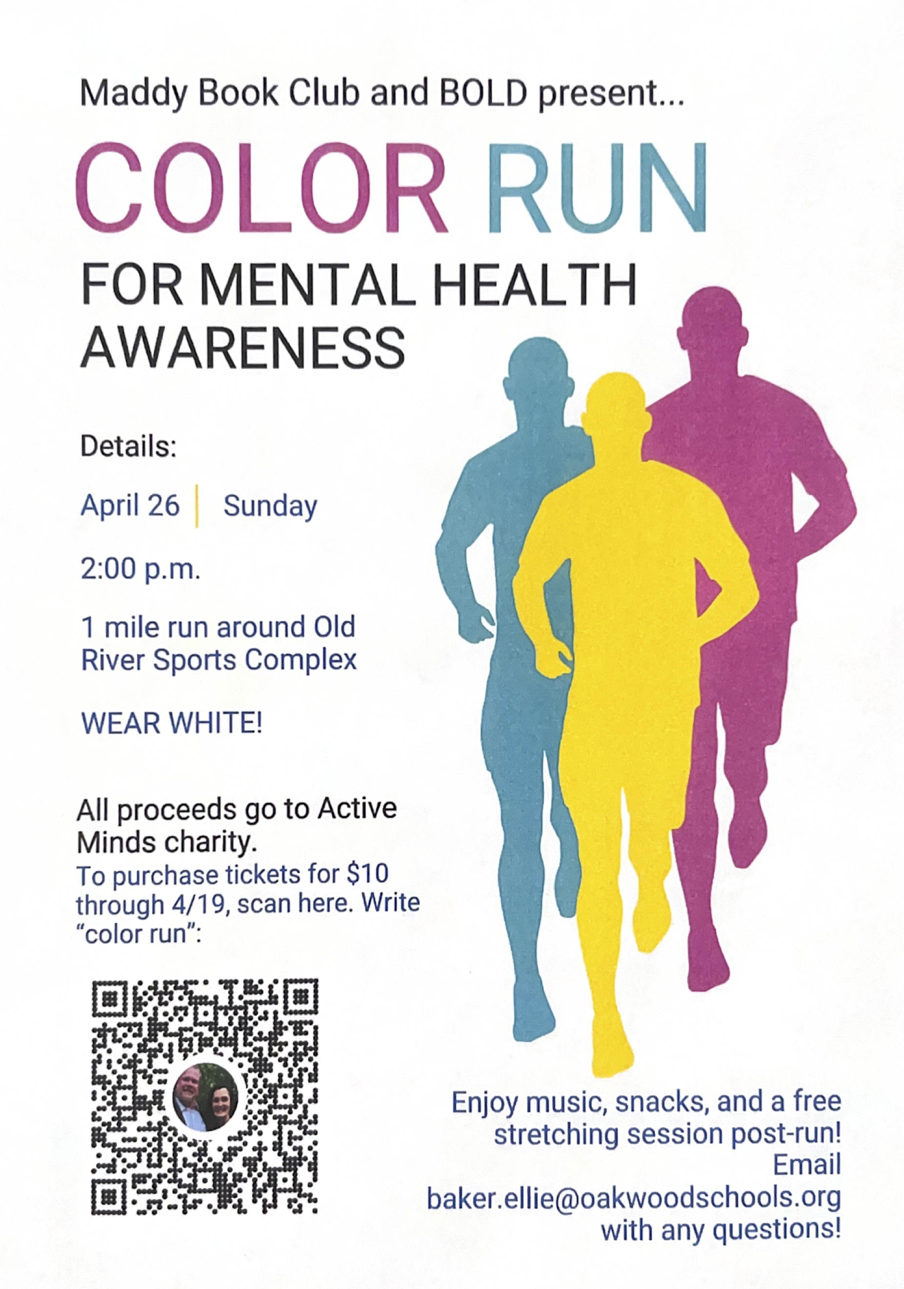 $10 to participate! All proceeds go to Active Minds Charity! Purchase tickets through QR code sign posted around the hallways, or Venmo Cassie-Darr-1 with subject line "color run" through April 19!