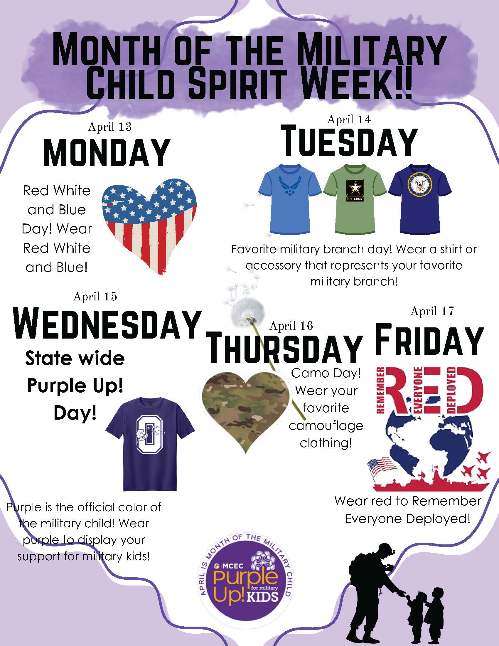 Let's show our military students support! Be sure to get your spirit clothing ready for the Month of the Military Child Spirit Week stating April 13! Make sure to wear red, white and blue on Monday, sport your favorite military branch gear on Tuesday, wear purple clothing on Wednesday, have some fun in camo on Thursday and wear red on Friday.
